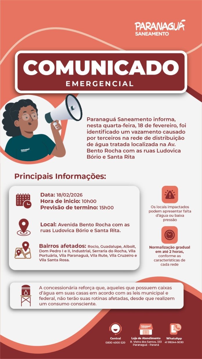 A Paranaguá Saneamento informa que nesta quarta-feira, 18 de fevereiro, foi identificado um vazamento causado por terceiros na rede de distribuição de água tratada localizada na Avenida Bento Rocha, esquina com as ruas Ludovida Bório e Santa Rita, afetando o abastecimento nas seguintes regiões: Rocio, Guadalupe, Alboit, Dom Pedro I e II, Industrial, Serraria do Rocha, Vila Portuária, Vila Paranaguá, Vila Rute, Vila Cruzeiro e Vila Santa Rosa. As equipes técnicas iniciaram os trabalhos às 10h e a conclusão dos serviços está prevista para às 15h. Após a manutenção, o abastecimento retornará à normalidade em até 2 horas.